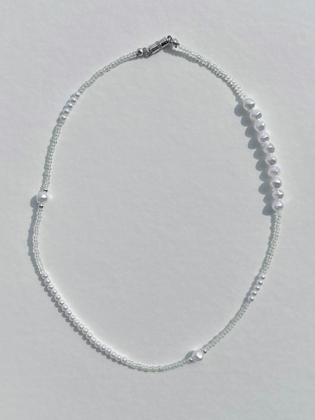 透明感のあるビーズとパールを組み合わせた、 やさしく涼しげなネックレス。 ランダムに配置されたパールが、 シンプルながらもさりげない個性をプラスしてくれます。 約40cmの長さで首元にすっとなじみ、 どんなコーデにも合わせやすいデザイン。 マグネット式で着脱も簡単◎ 忙しい日でもストレスなく使えます! marscotが提案する、 毎日に寄り添うアクセサリー。 price:¥1,500 ご注文後、1〜2日で発送可能です! サイズの変更はできません。