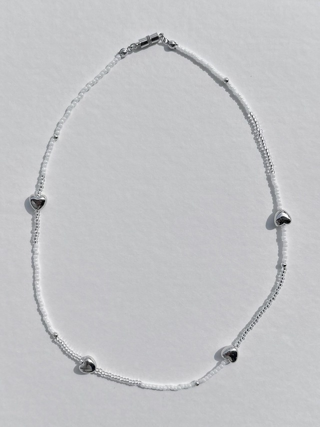 透明感のあるビーズとシルバーを組み合わせた、 やさしく涼しげなネックレス。 ランダムに配置されたハートのビーズが、 シンプルながらもさりげない個性をプラスしてくれます。 約40cmの長さで首元にすっとなじみ、 どんなコーデにも合わせやすいデザイン。 マグネット式で着脱も簡単◎ 忙しい日でもストレスなく使えます! marscotが提案する、 毎日に寄り添うアクセサリー。 price:¥1,500 ご注文後、1〜2日で発送可能です! サイズの変更はできません。