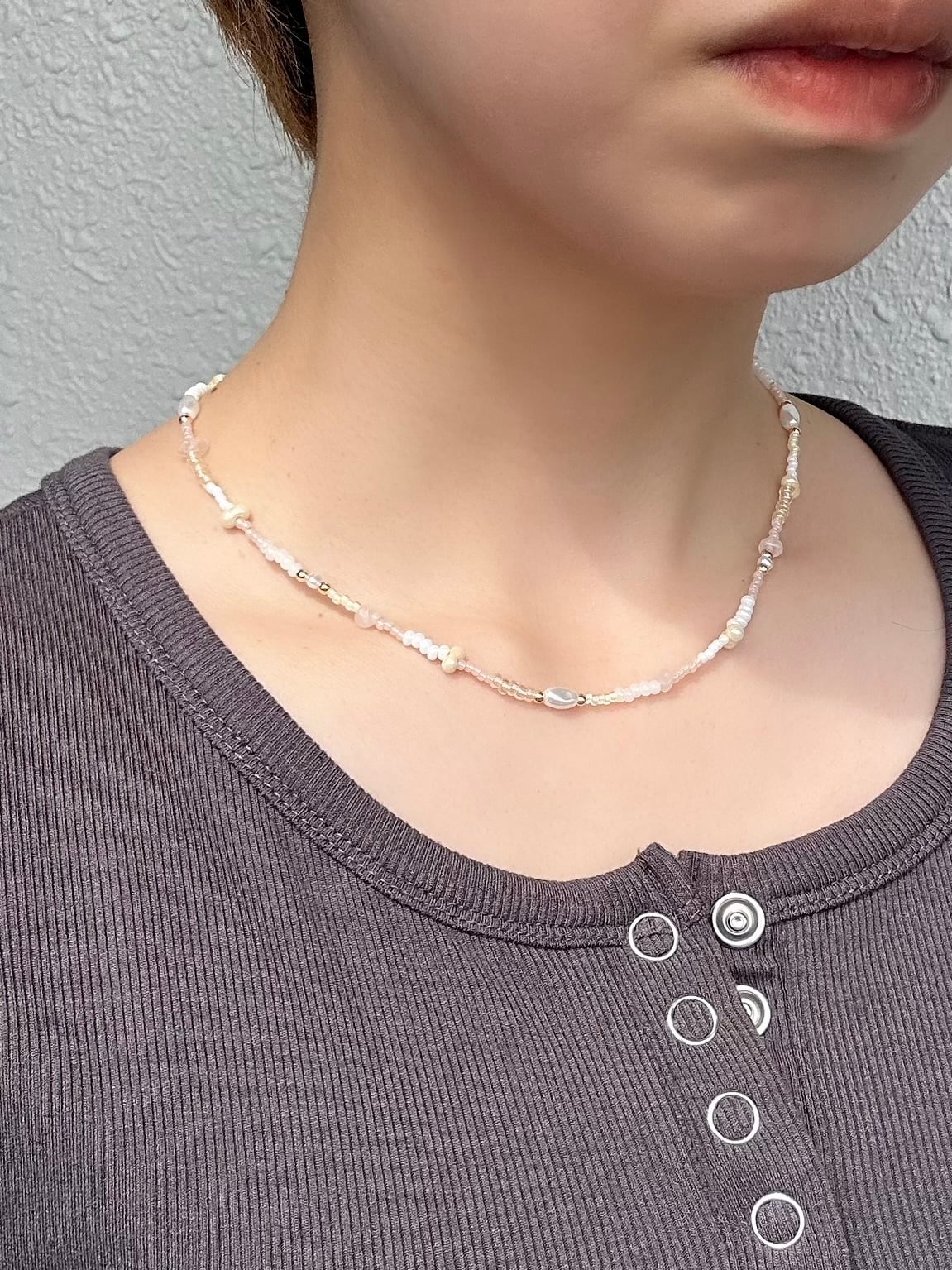 約40cmの長さで首元にすっとなじみ、