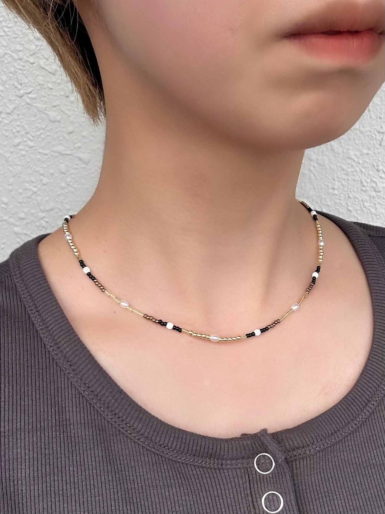 約40cmの長さで首元にすっとなじみ、